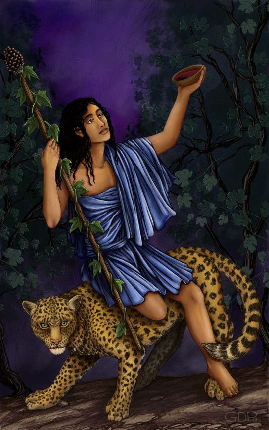 Dionysos is zoon van Zeus en Semele. Hij zou zijn geboren uit het dijbeen van zijn vader, Zeus. Om uit de handen van zijn jaloerse stiefmoeder Hera te blijven groeide hij op in een afgelegen streek. Vaak is hij afgebeeld met een druiventros of wijnbeker in de hand en een krans van druivenbladeren op het hoofd.